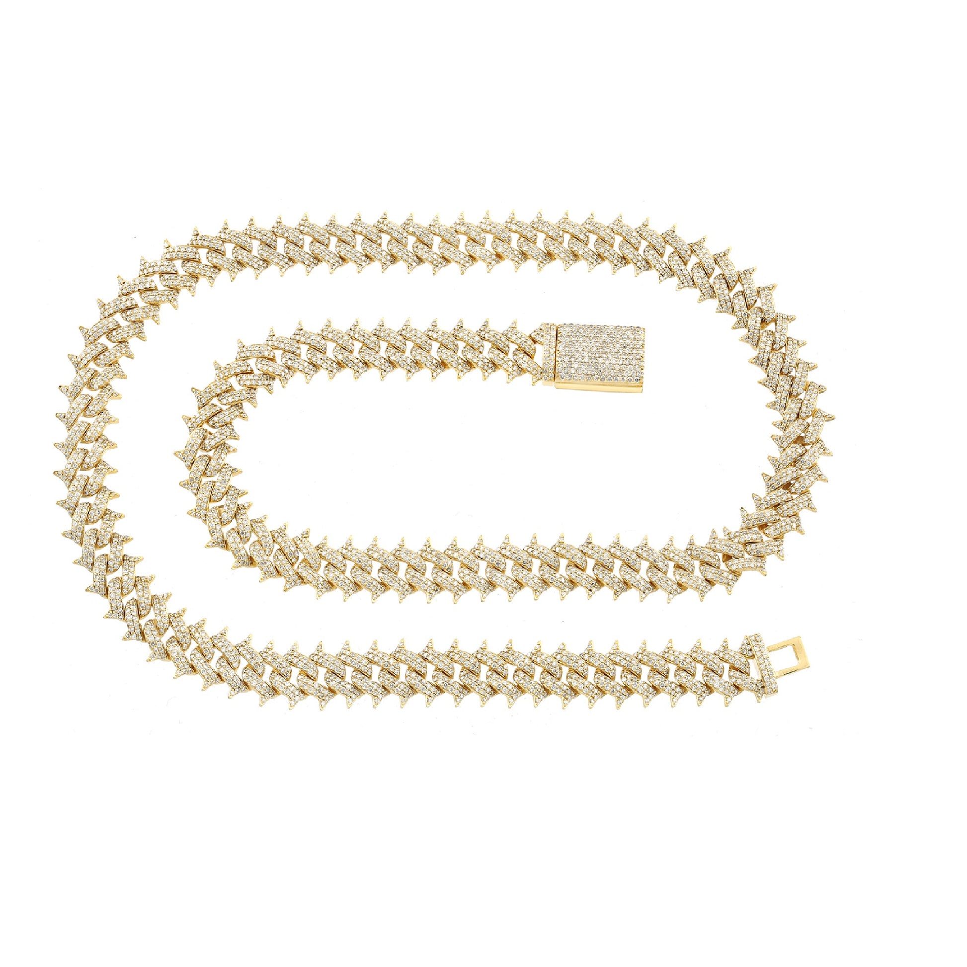 Choose this chain for its fierce spike-edge pattern, premium gold craftsmanship, and dazzling 14.50ct diamond coverage. The design offers strong visual presence and depth not found in traditional Cuban links. Built for comfort and durability, it’s ideal for artists, trendsetters, or anyone wanting a statement chain that commands attention. Bold, unique, and luxurious — this piece sets its own standard.