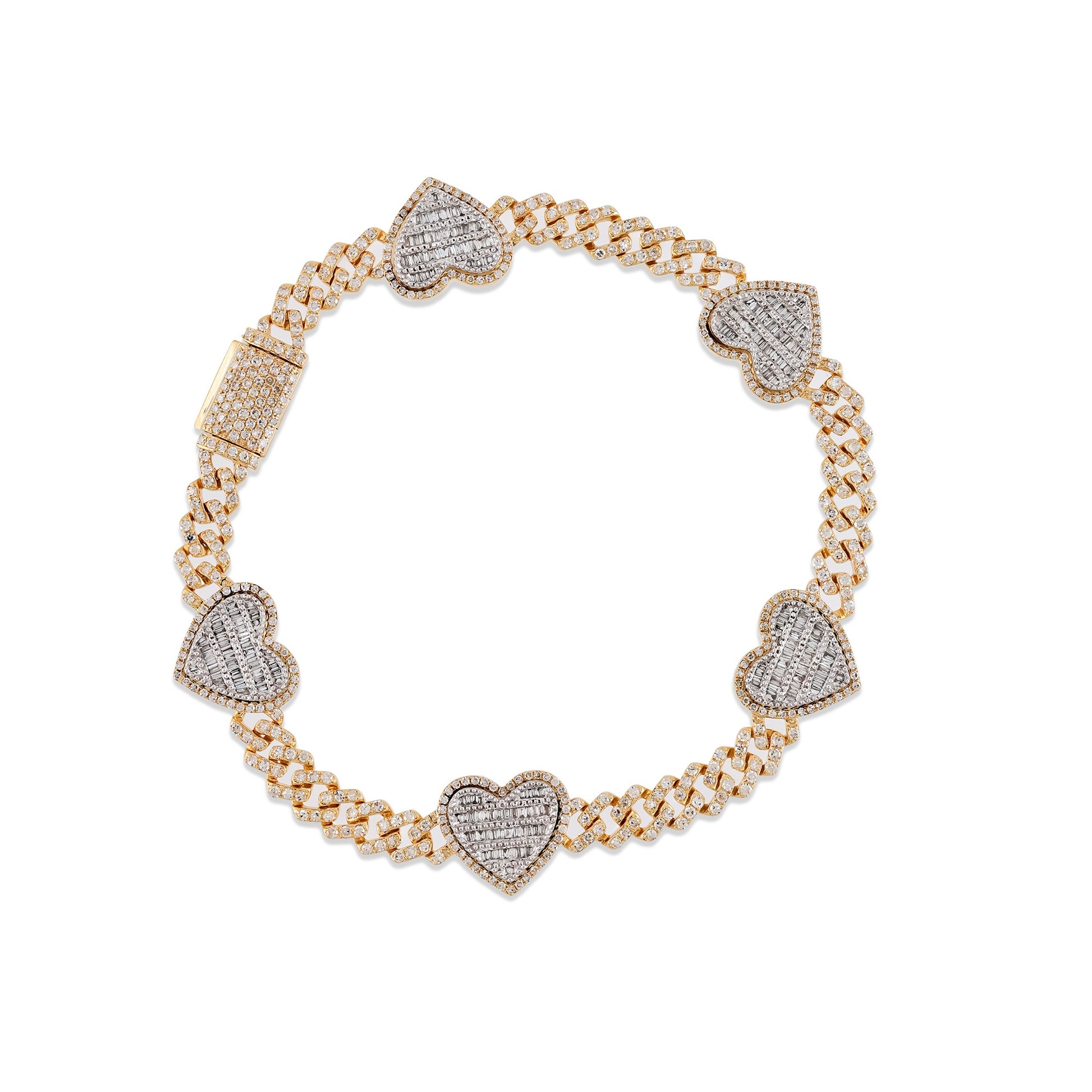 This Heart Diamond Cuban Link Bracelet by Truth Jewel pairs a classic Cuban profile with romantic heart stations for a look that’s both bold and sentimental. Crafted in polished yellow gold, the bracelet features a fine diamond Cuban chain punctuated by larger heart-shaped tops, each fully set with shimmering round diamonds in tight rows that mimic a baguette effect. The hearts sit slightly proud of the chain, creating a soft rhythm of sparkle around the wrist, while the Cuban links keep the piece flexible and comfortable. Finished with a wide pavé box clasp that continues the diamond story, this bracelet is available in 10KT, 14KT, and 925 silver, offering a statement of love that feels luxurious enough for special occasions and strong enough for everyday wear.