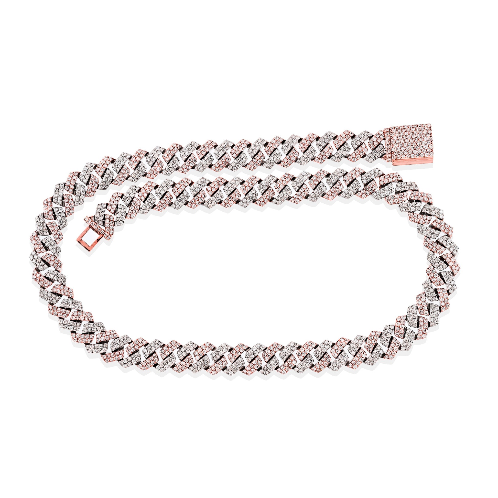 Choose this necklace if you want a Cuban link that looks custom and high-end the moment it’s on. The two-tone effect—rose gold peeking between bright diamonds—adds depth and dimension to the classic Cuban pattern, and the shorter 17-inch length makes it perfect for stacking with longer pieces or wearing as a standalone statement. Every link is engineered to move cleanly with the body, and the pavé box clasp keeps the design locked in and visually uninterrupted. With substantial diamond coverage and signature Truth Jewel craftsmanship, this chain is made for collectors who expect their jewelry to stand out.