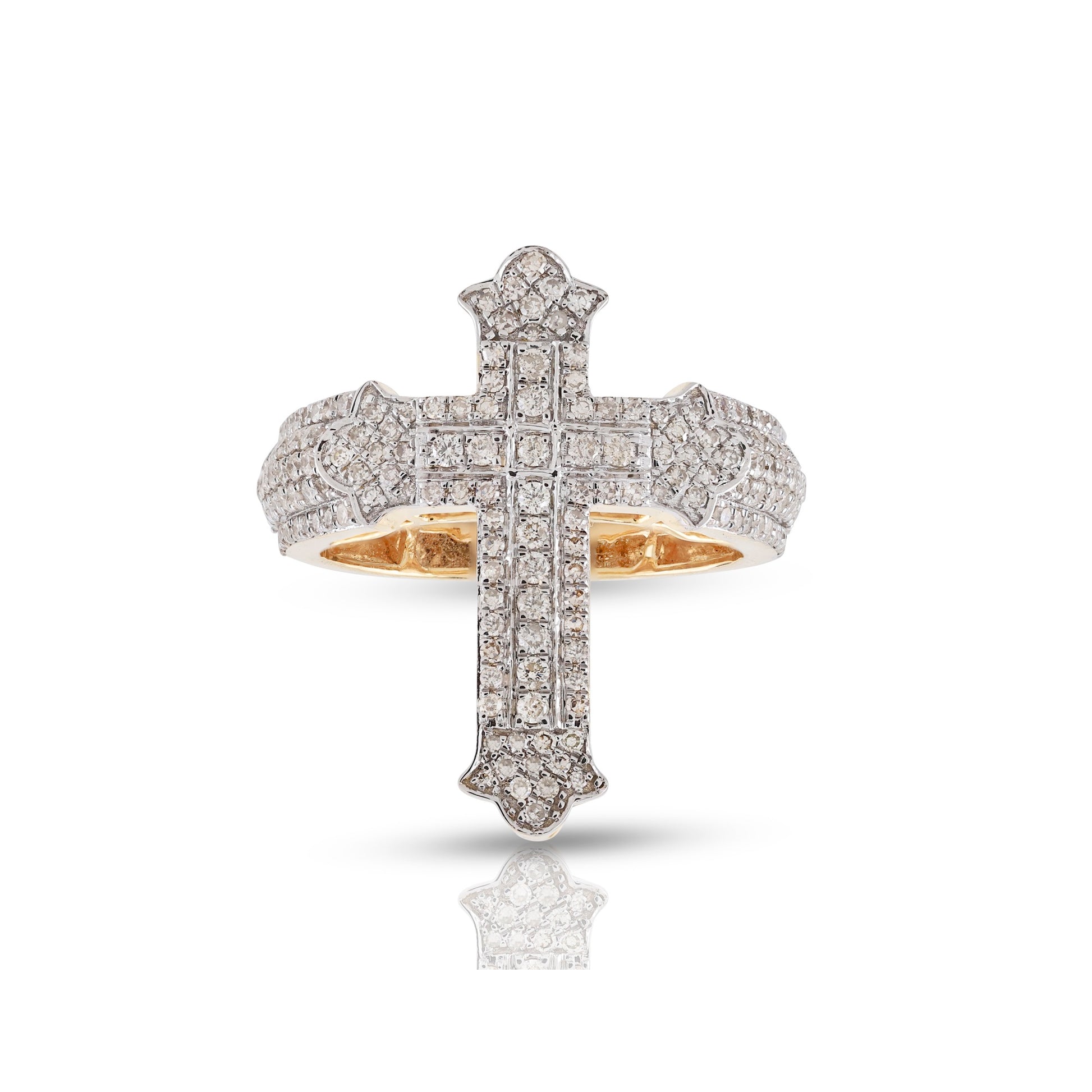The Yellow Gold Round Diamond Cross Ring features a stunning design crafted from 10kt yellow gold, adorned with round diamonds.This elegant piece combines religious symbolism with contemporary style, making it a perfect accessory for everyday wear and special occasions. Its timeless appeal enhances any jewelry collection