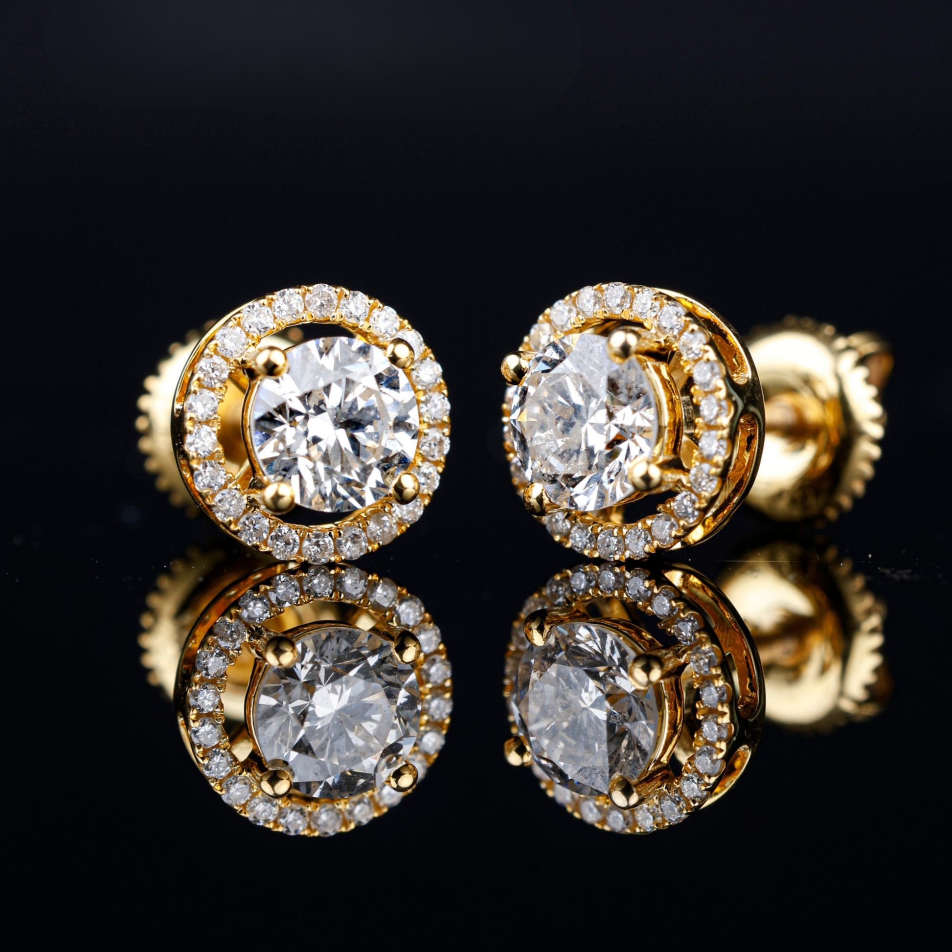 yellow gold diamond halo stud earrings feature brilliant round center stones surrounded by a sparkling halo of diamonds for enhanced shine and size appearance. Designed with secure screw backs, they offer timeless elegance and everyday luxury. Perfect for gifting, bridal wear, or elevating your fine jewelry collection.