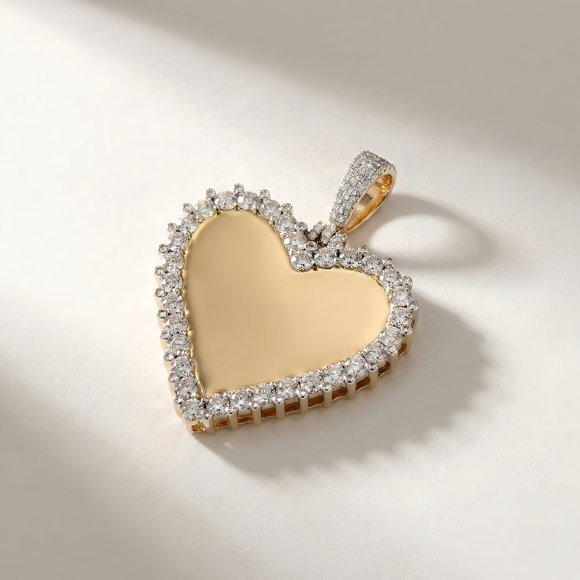 Choose this pendant for its classic heart silhouette combined with a sophisticated diamond halo that never goes out of style. The plain gold center gives you the freedom to keep it minimal or customize it with engraving, turning it into a unique memory piece. Crafted with high-quality materials and precise stone setting, it offers long-lasting shine and durability. With flexible options in 10KT, 14KT and 925 silver, this pendant is a versatile choice for gifts, anniversaries, birthdays, or as a daily reminder of someone special.
